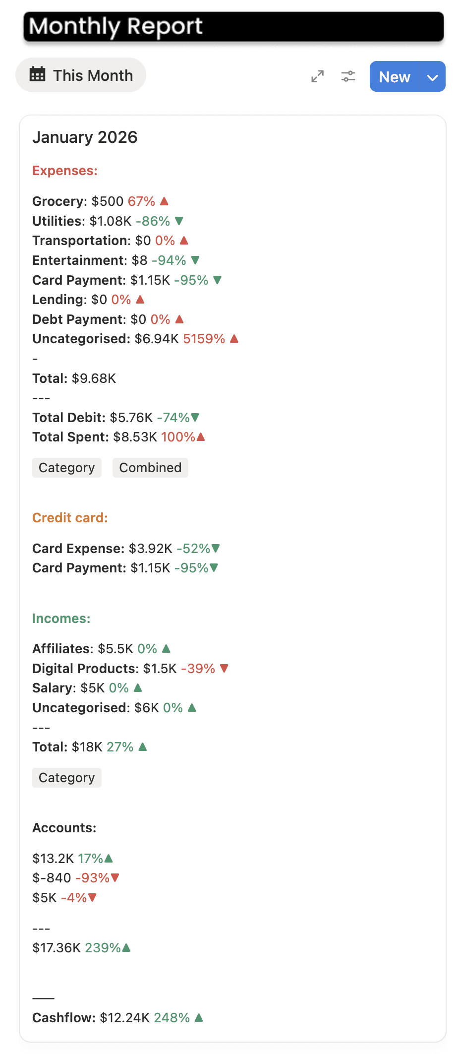 Get automatic monthly & yearly reports with transactions summary and cashflow.