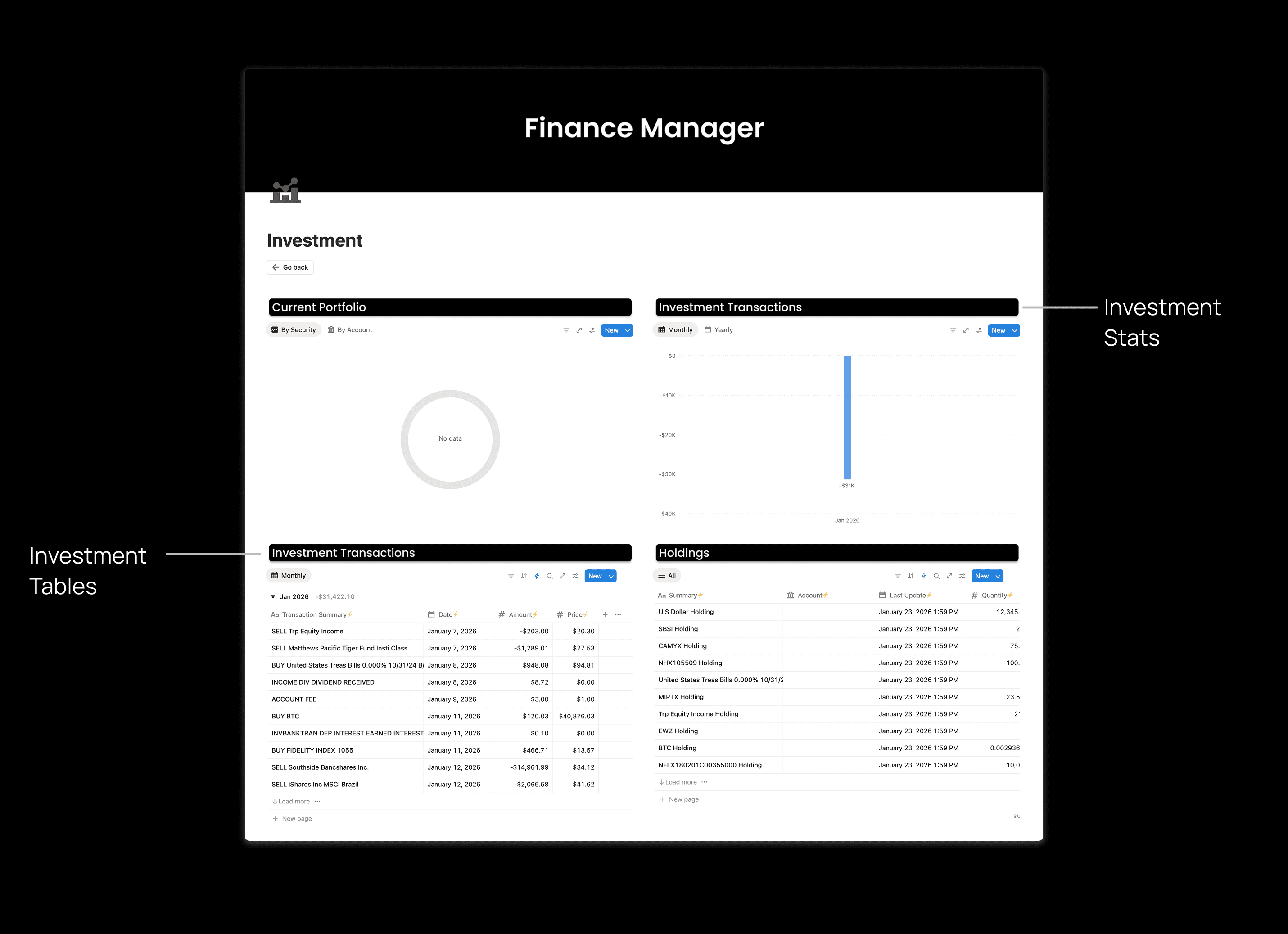 Finance Manager supports integrations with Finta, which can automatically sync all your bank transactions and investments with details like date, account, and category.