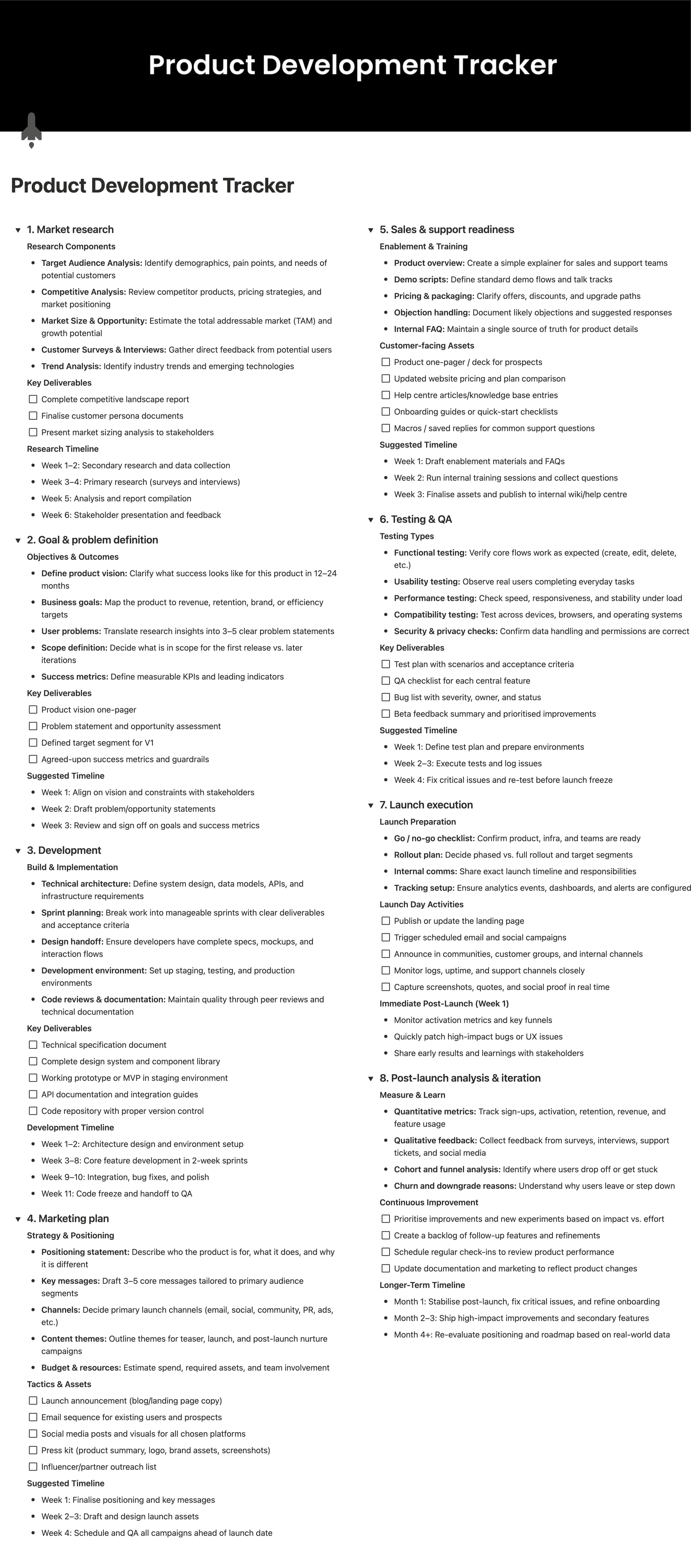 A complete framework to guide your product from initial research through post-launch iteration. Track market research, define goals, manage development, coordinate marketing and sales, ensure quality, and measure result.