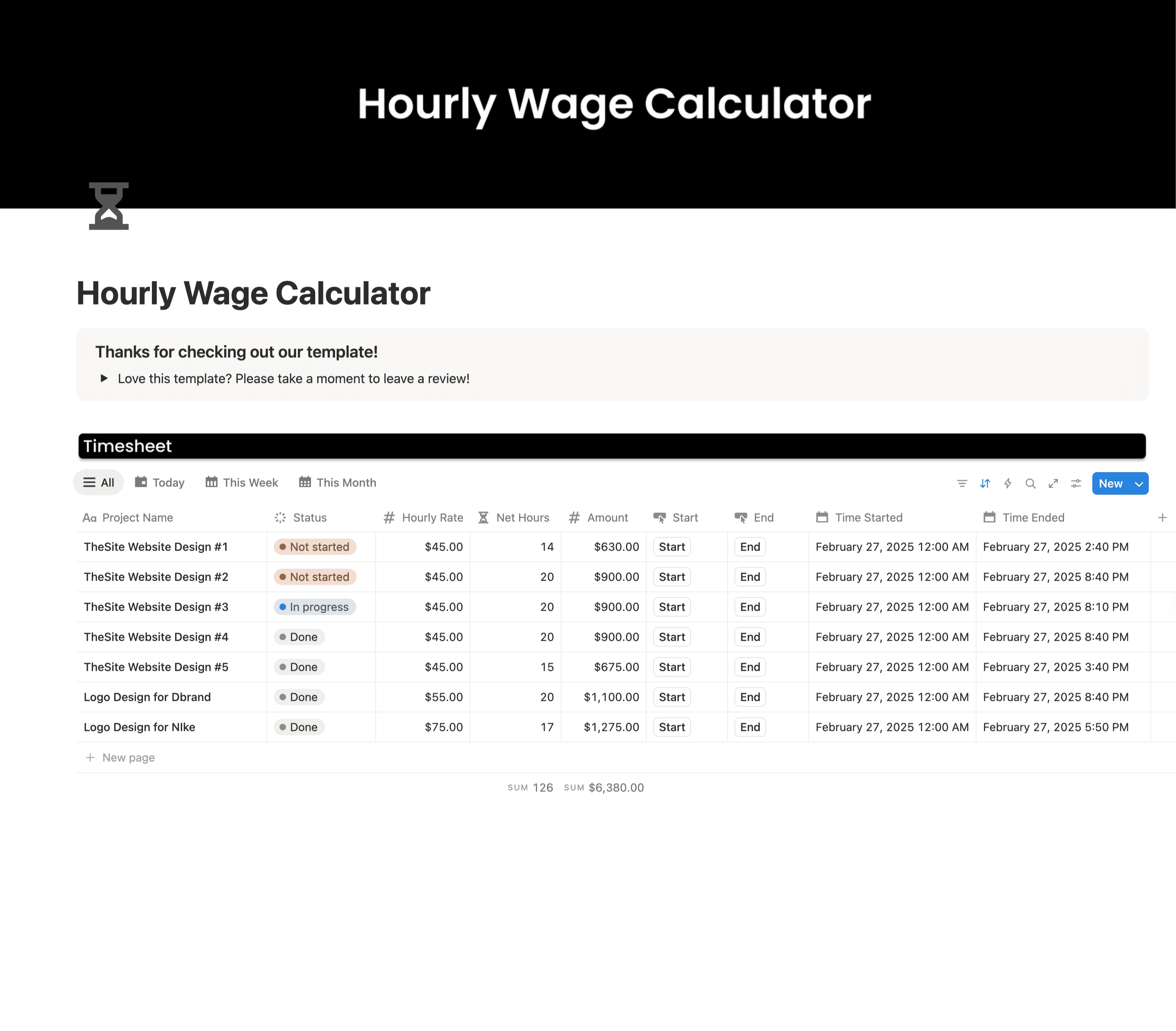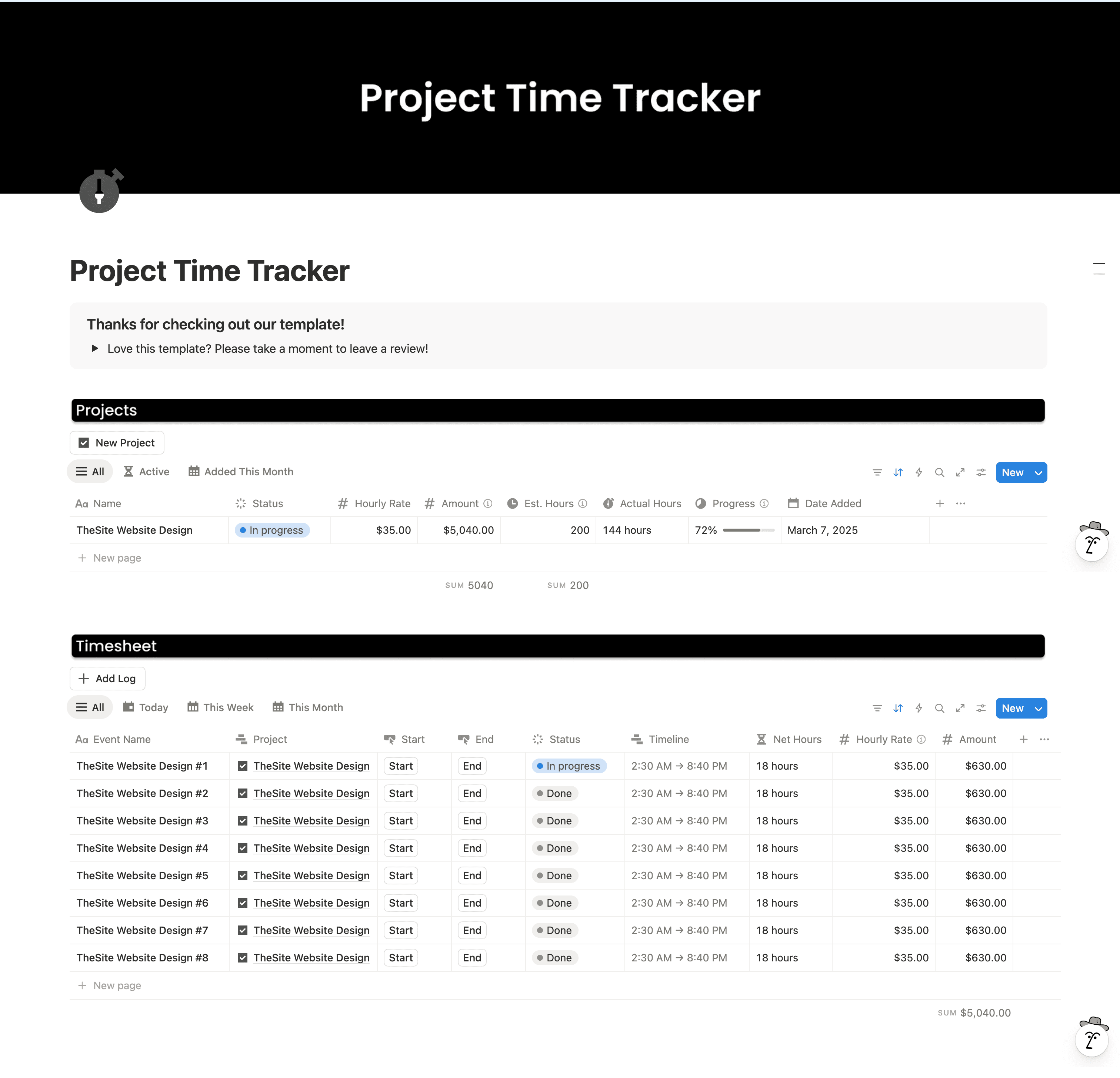 A template that helps you to create projects and track how long you have worked.