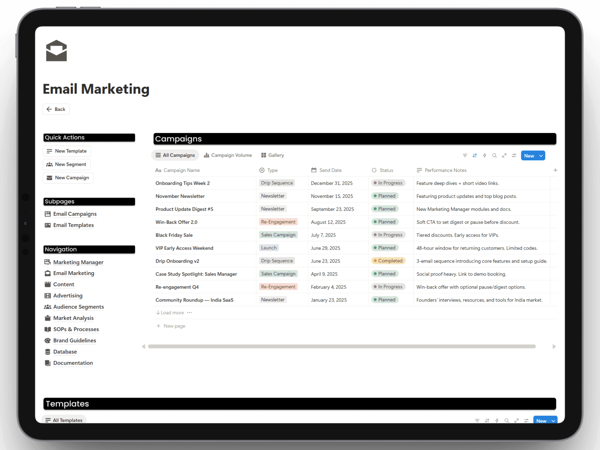 It further includes over 15 database page templates for detailed records on roles, performance reviews, and various other page types