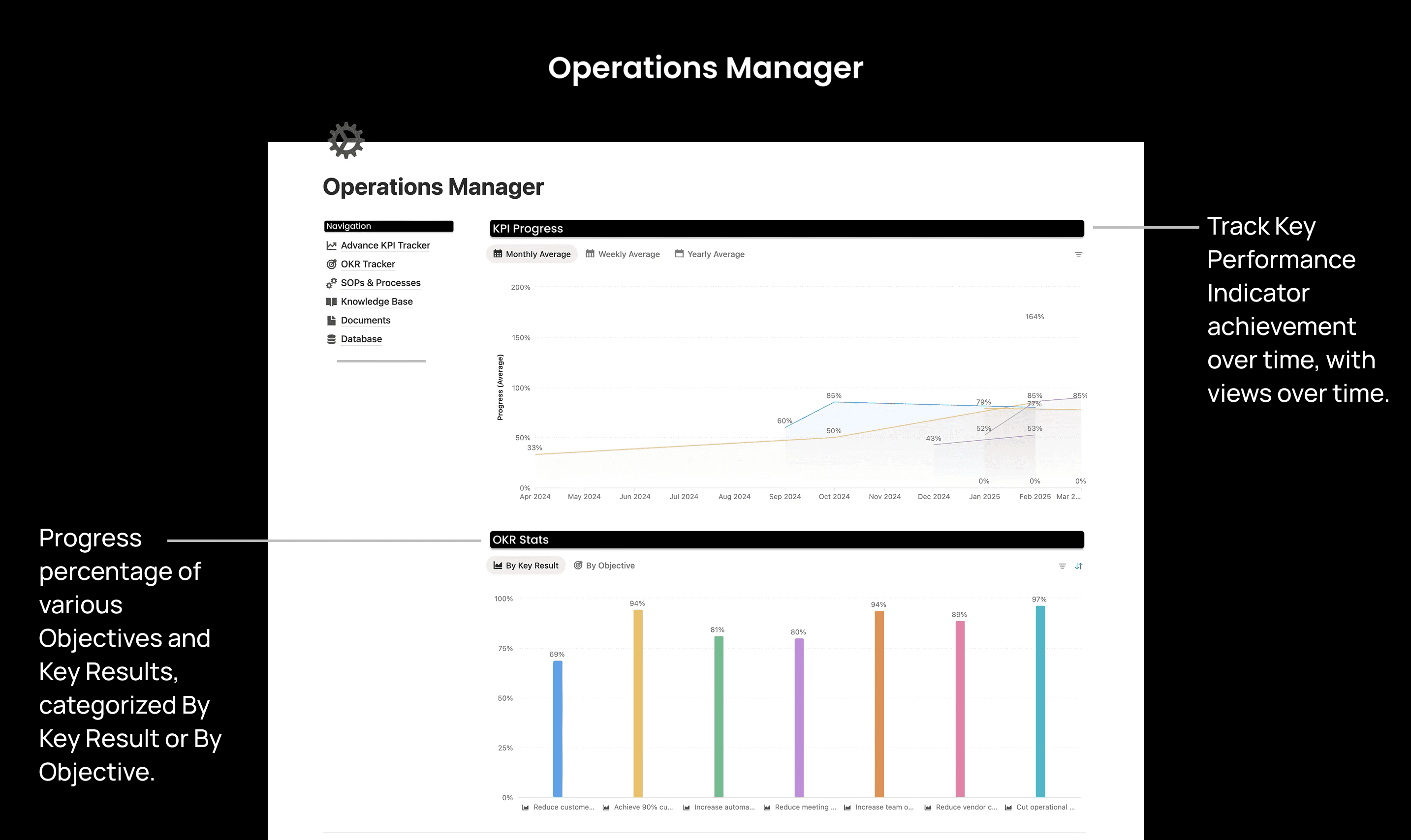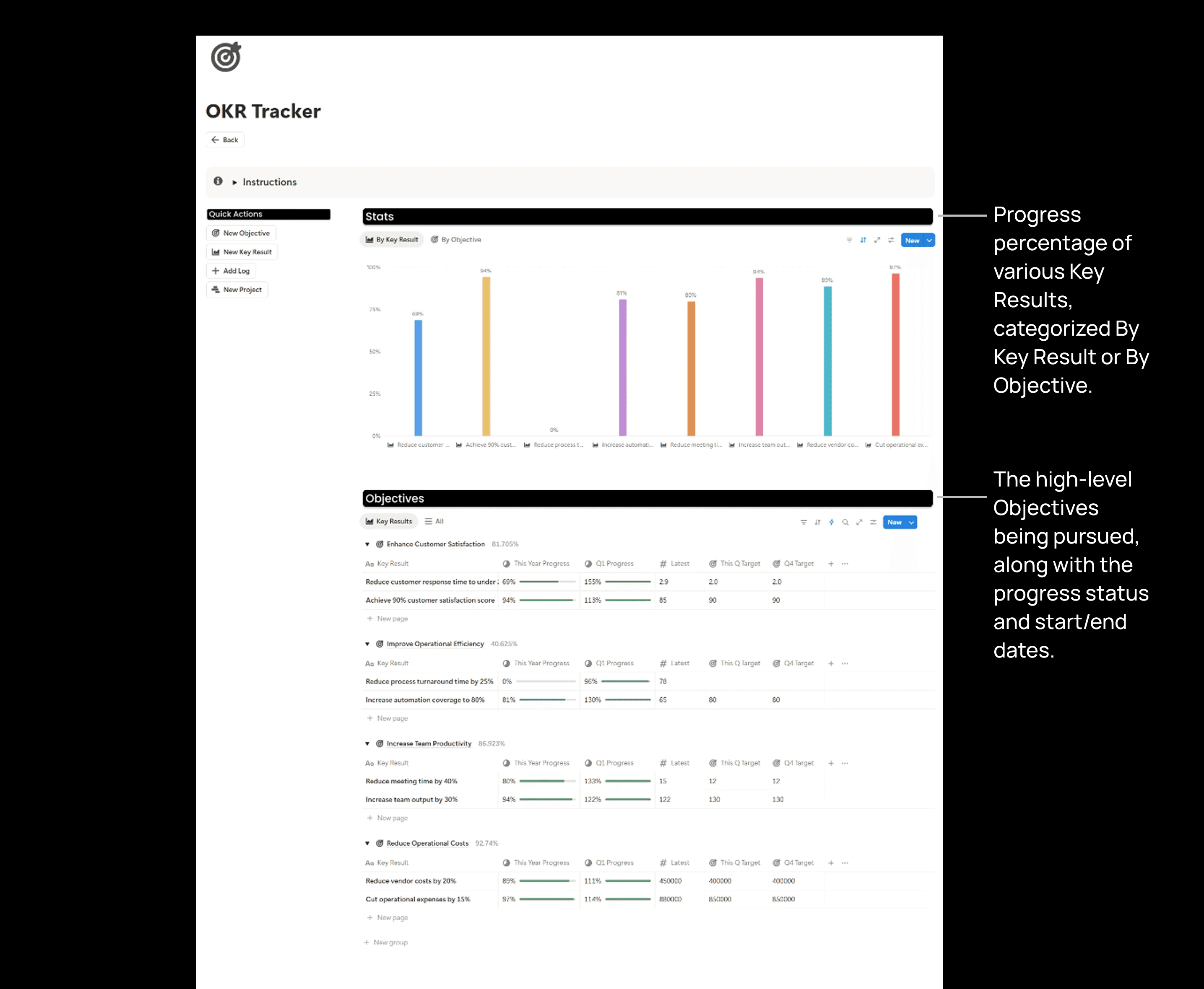 Align your team around objectives and key results with a complete goal-setting framework. Create objectives with measurable key results, track progress with actual vs. target data logging, link related projects to key results, and visualize achievement across quarters and months.